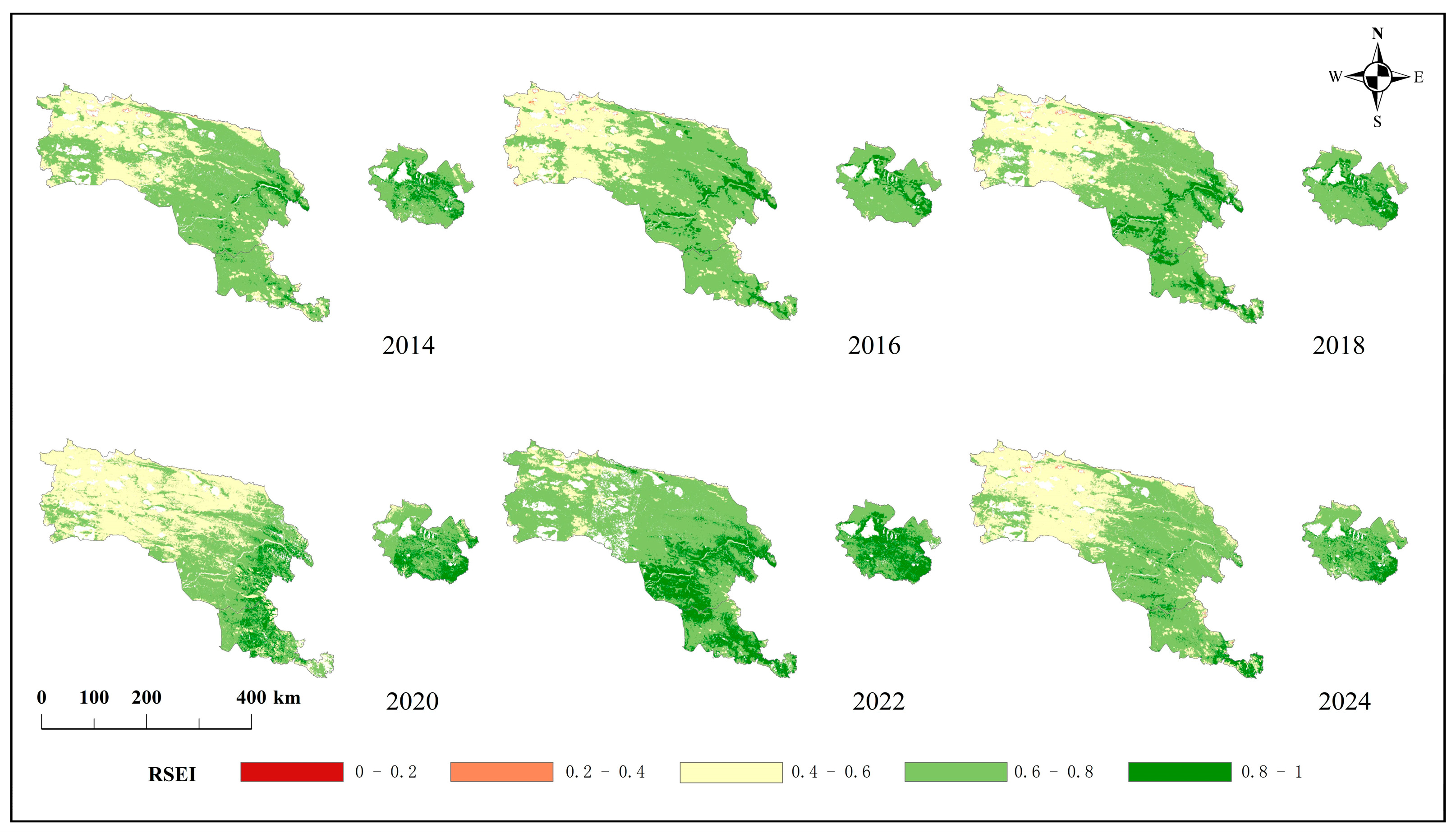- Wen, C.; Long, T.; He, G.; Jiao, W.; Jiang, W. Temporally Enhanced RSEI and Nighttime Lights Reveal Long-Term Ecological Changes and Effective Protection in China’s Inaugural National Parks. Ecol. Indic. 2025, 170, 112981. [Google Scholar] [CrossRef]