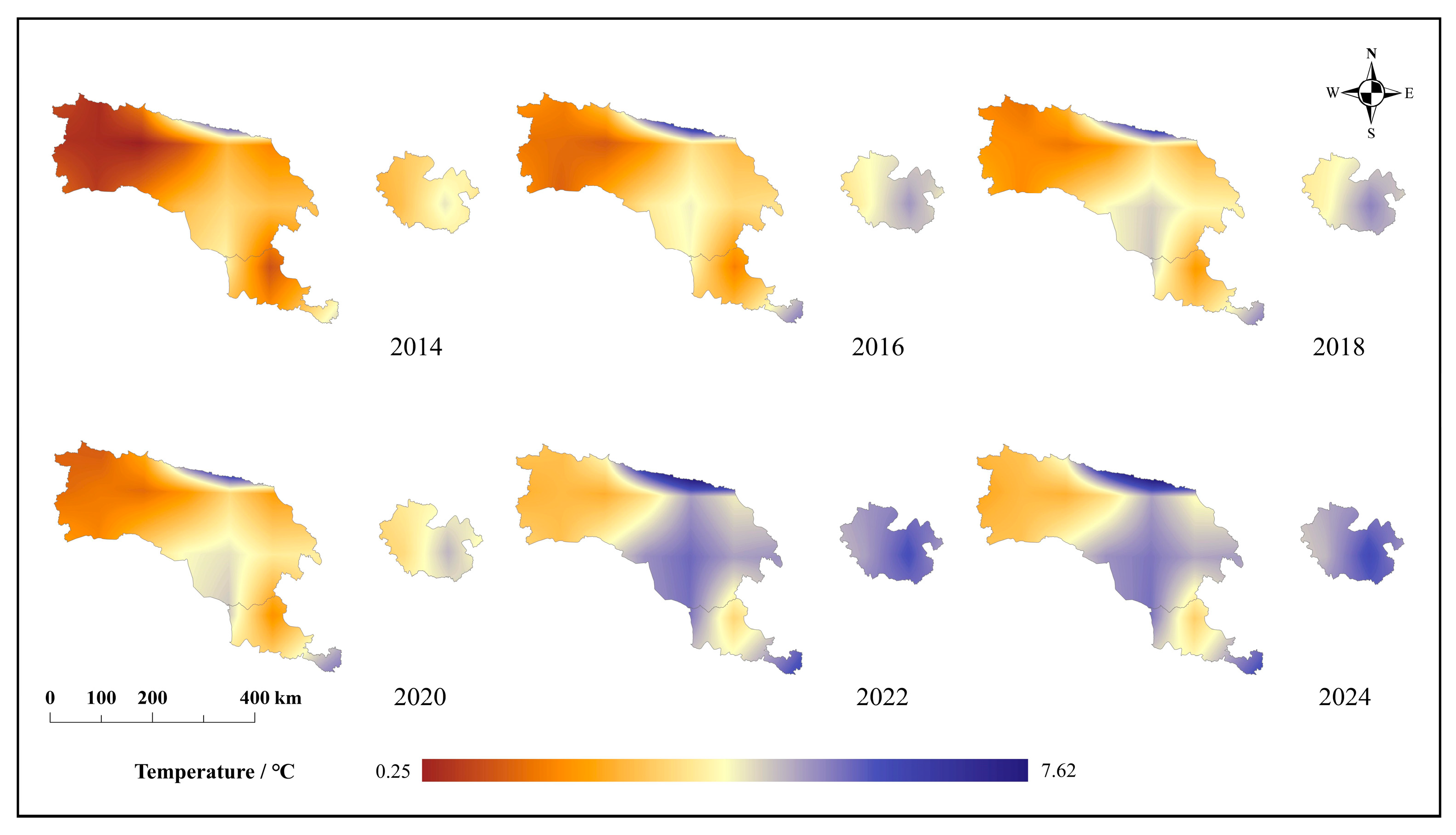- Wang, Y.; Lü, Y.; Lü, D.; Yin, L.; Wang, X. Climate Change and Its Ecological Risks Are Spatially Heterogeneous in High-Altitude Region: The Case of Qinghai-Tibet Plateau. CATENA 2024, 243, 108140. [Google Scholar] [CrossRef]