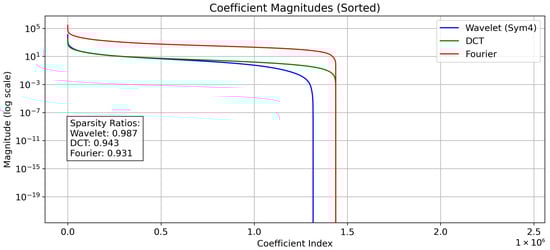 Sorted coefficient magnitudes (log scale) for different transform domains applied to a HyperHeight Data Cube (HHDC). The wavelet transform (Sym4), Discrete Cosine Transform (DCT), and Fourier transform are evaluated for their ability to concentrate energy into a small number of coefficients. The sparsity ratio, defined as the proportion of near-zero coefficients, is highest for the wavelet domain (0.987), indicating superior compressibility. This analysis underscores the wavelet domain’s effectiveness for the sparse representation of HHDC data.