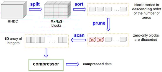 To apply both RC & RLE (skip zeros) and RC & RLE (repeat zeros) to HHDCs, the transform of three-dimensional tensors into a one-dimensional array is required. This procedure can be performed with respect to the storage order of tensors in memory, which maximizes the efficiency of utilizing the computing system’s memory hierarchy []. At the same time, other data scan orders, which ensure better compression, might exist. Indeed, some HHDCs might contain large parts composed exclusively of zeros, and the proper usage of this feature could improve the efficiency. Further, we suggest an approach that exploits particular structural features of HHDCs.
