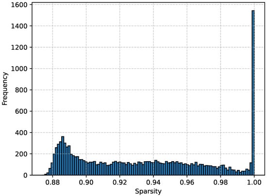 By definition, the entries of HHDCs, which are three-dimensional tensors, are nonnegative integers. Furthermore, in most cases, the set of these values constitutes a highly imbalanced dataset (see Figure 4). Zero is the most frequent value, and its frequency is significantly higher than the total number of all other entries. So, HHDCs are highly sparse. Sparsity can be measured as follows