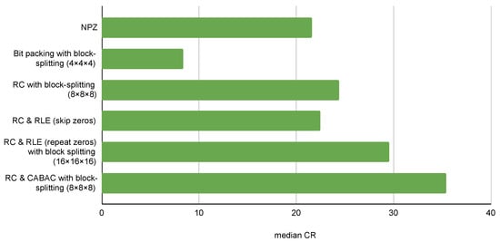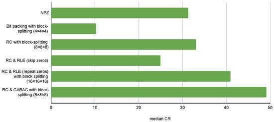 - RC & CABAC. This technique is performed as follows. First, each element of the compressed array is encoded using the RC method. Then, context-adaptive binary arithmetic coding (CABAC) is applied to the obtained bitstream. CABAC is a lossless coding method that performs arithmetic coding for binary symbols []. It uses context-dependent probability models of the encoded data. These models are continuously updated to capture local statistical correlations. CABAC provides nearly optimal bitstream compression; however, this technique is slower than other methods due to the large number of multiplication operations involved. So, unlike bit packing, its efficiency can be considered an upper-bound estimate.