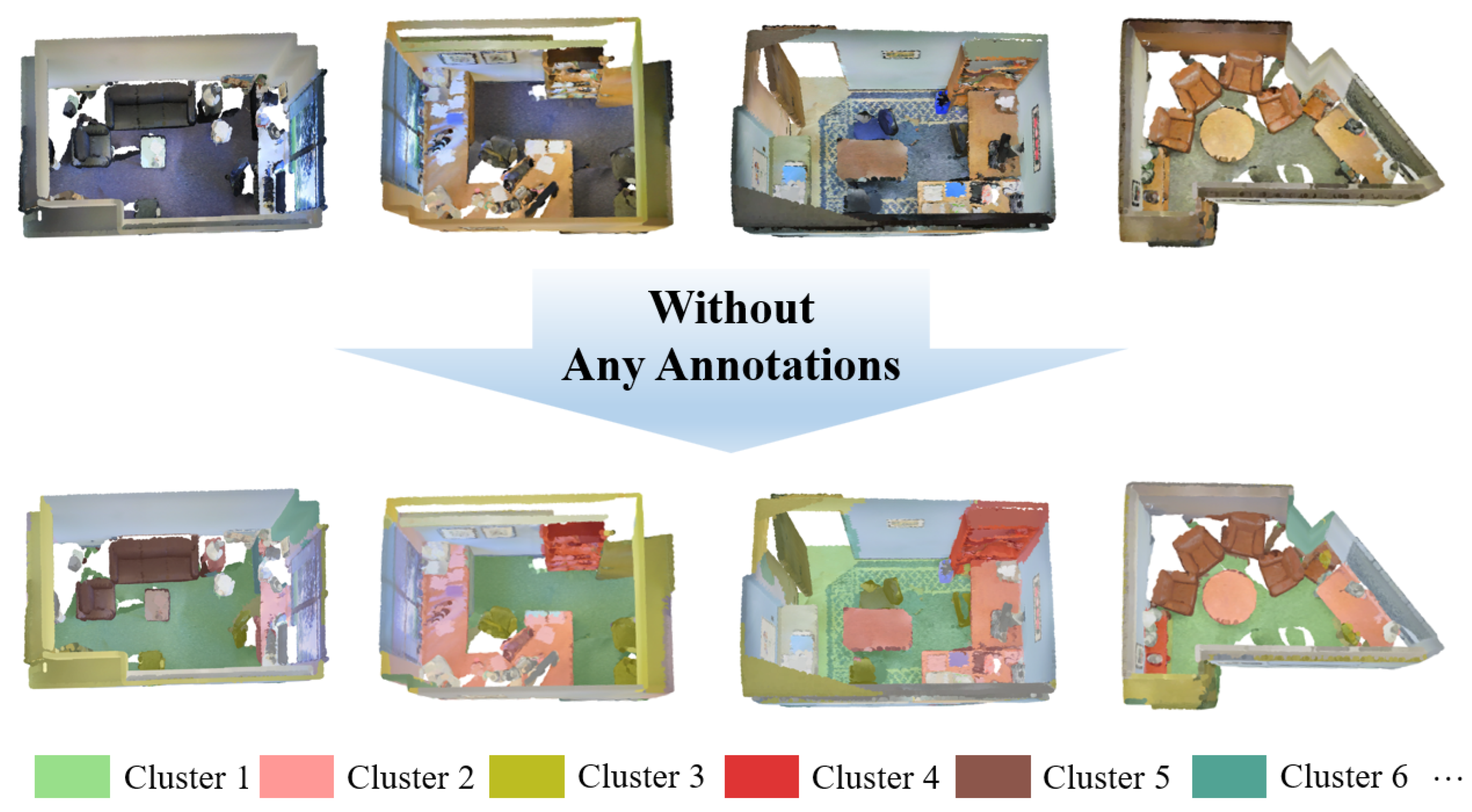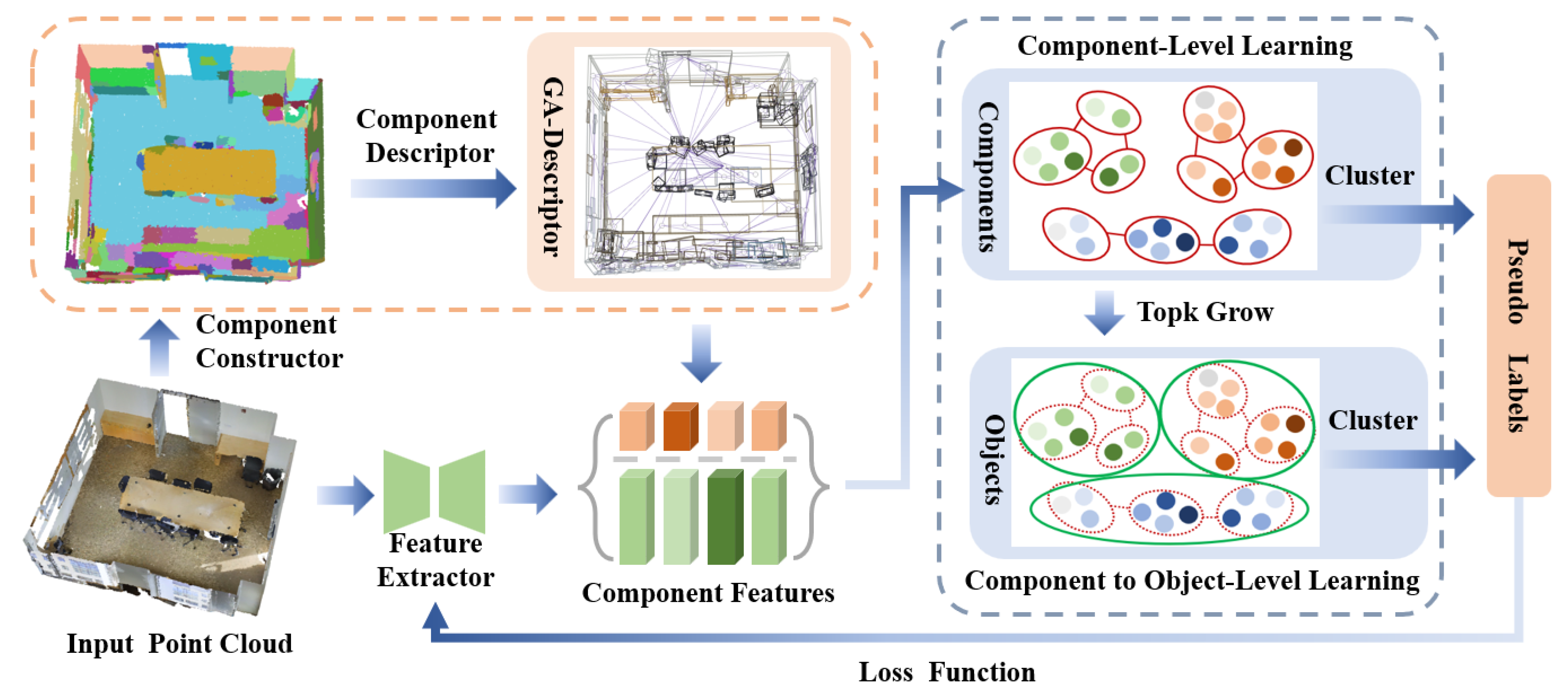 - We propose CGHP, a component-guided hierarchical progressive framework that achieves unsupervised 3D point cloud segmentation without any manual annotations, 2D data, or pre-trained models.