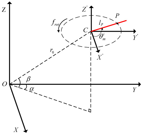 The radar is located at Origin O of the coordinate system (X, Y, Z). The reference coordinate system is used to describe the rotation of rotor, and Origin C denotes the center of rotor. The rotation of rotor occurs within the plane, which is parallel to the (X, Y) plane. P is a point on the mth blade with an initial rotation angle , (), and the length of PC is , . For simplification, the azimuth angle is set as zero in the following derivation. The meanings of the remaining symbols used in the derivation are listed in Table 1.