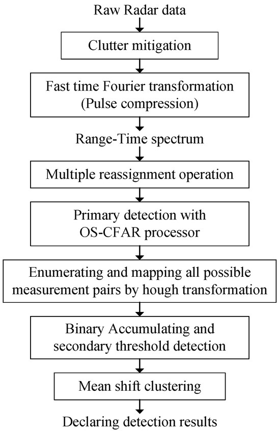 The block diagram of the proposed detection method is shown in Figure 3. In addition to the above processes, two other steps involving the clutter mitigation and mean shift clustering should also be included. Before the reassignment operation, a high-pass filter over slow time domain is applied to the range–time spectrum to remove the ground clutter and its multi-path signals.