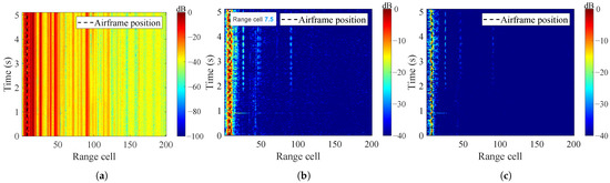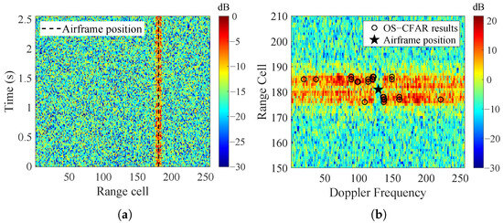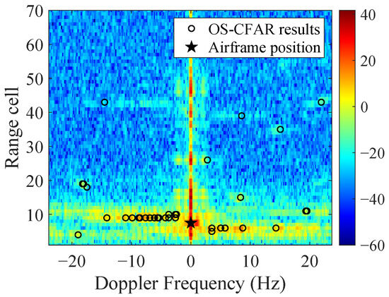 Figure 4a gives the simulated range–time spectrum accounting for the rotors without considering the airframe scattering. The SNR, defined as the ratio of average signal power to average noise power, is set to be 8 dB. It is observed that the spectrum is spread along range dimension. Figure 4b is the range–Doppler (RD) spectrum obtained by performing Fourier transformation of Figure 4a over the slow time dimension. In addition to the range coupling, the Doppler spread is also significant due to the changing rotation speed and RCS of rotors. With traditional order statistics constant false alarm rate (OS-CFAR) detection methods, the MDS originated from a single target is identified as multiple targets (as marked by the black circles in Figure 4b).