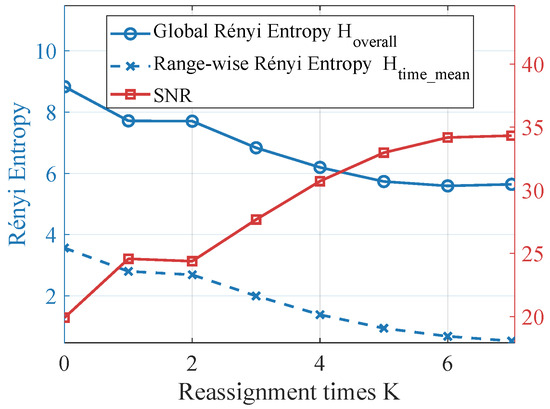 Figure 5 shows the range–time spectra after one and four iterations of reassignment, where a reduction in range–domain spreading with iteration number can be observed. Figure 6 presents the evolution of the second-order Rényi entropy and the signal-to-noise ratio (SNR) over 1 to 7 iterations, demonstrating how spectral concentration and detectability improve with increasing iteration number.