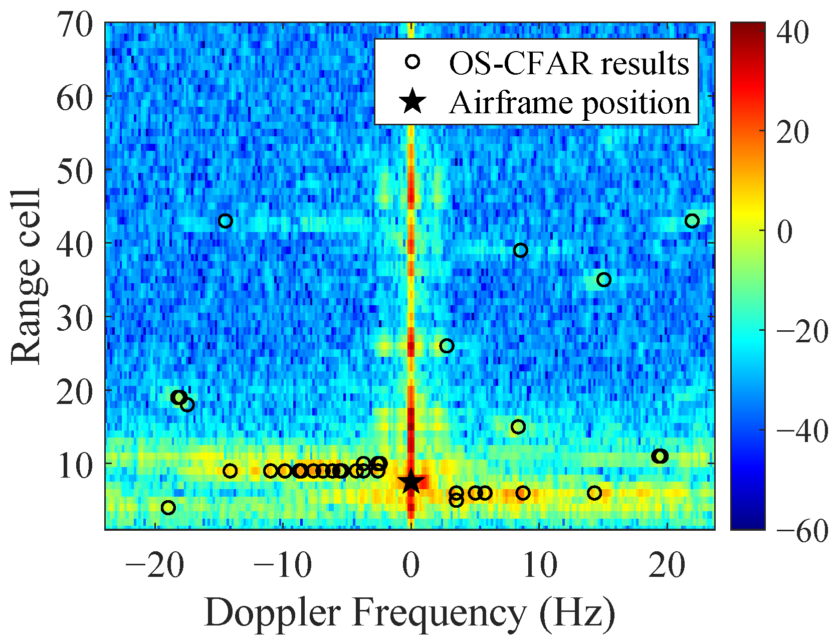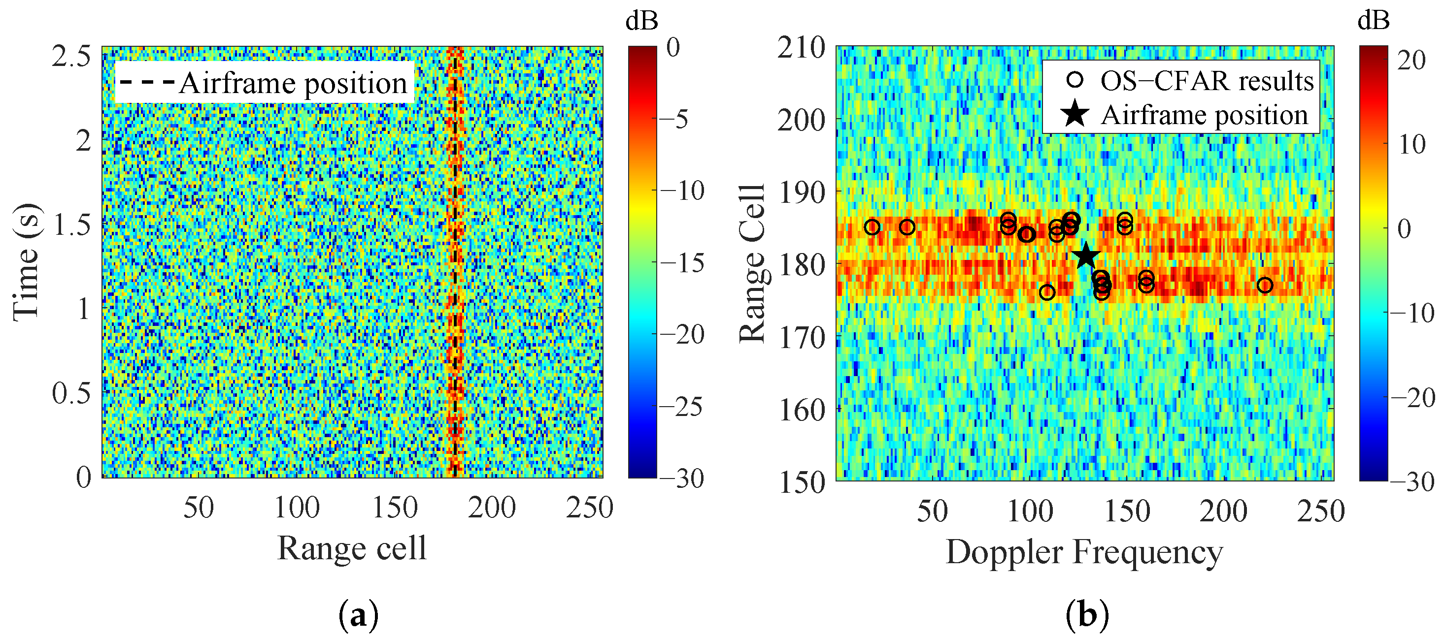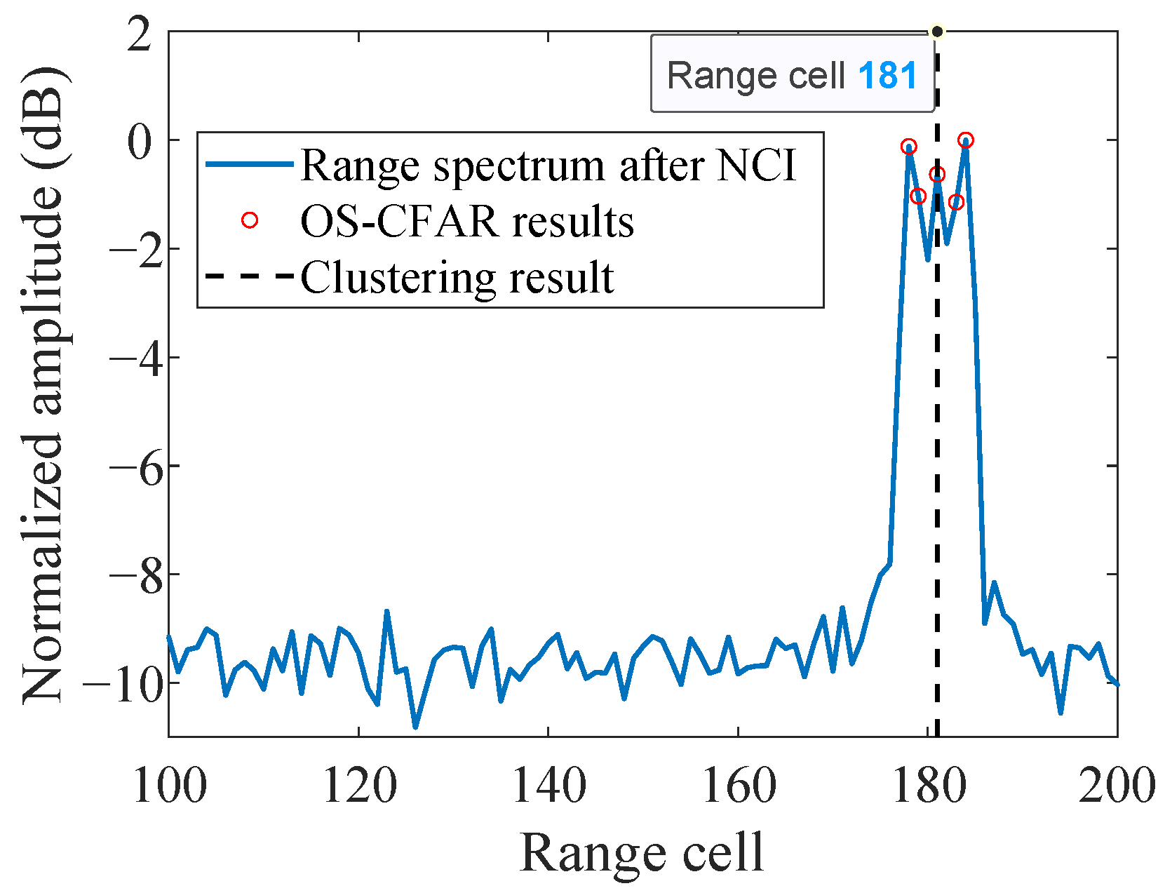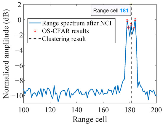 OS-CFAR and clustering processed results of the incoherently accumulated range–time spectrum.
