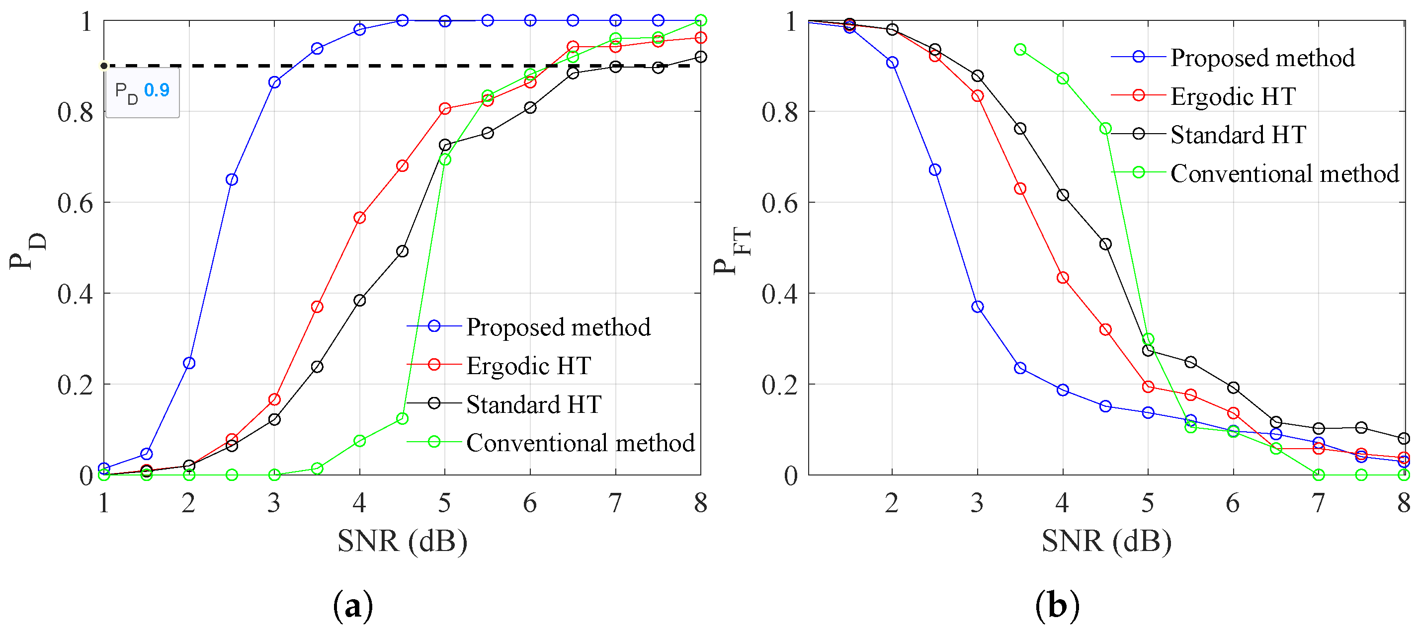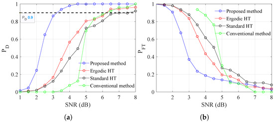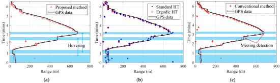 Target’s range–time variation detected using (a) the proposed method, (b) the ergodic and standard HT methods, and (c) the conventional method.