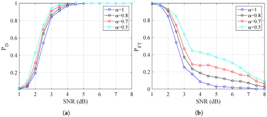 Based on the binary accumulation, the secondary threshold detection method can be employed to reduce the false alarm rate. Assuming the maximum accumulation value in the Hough parameter space is , the threshold is selected to distinguish targets from clutters, where is the threshold coefficient. The measurements associated with an accumulation value higher than are then processed by the mean shift clustering algorithm [45] to further reduce the false alarms, and the results are declared as final targets. A small means a high detection probability and a high false alarm rate, which is empirically set as 0.8 here. A more detailed investigation of the effect of is presented in the simulation and experiment results.