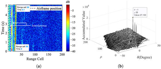 Results of the moving DJI M600Pro, (a) range–time spectrum after clutter mitigation and MRS process, (b) Hough parameter accumulation result.