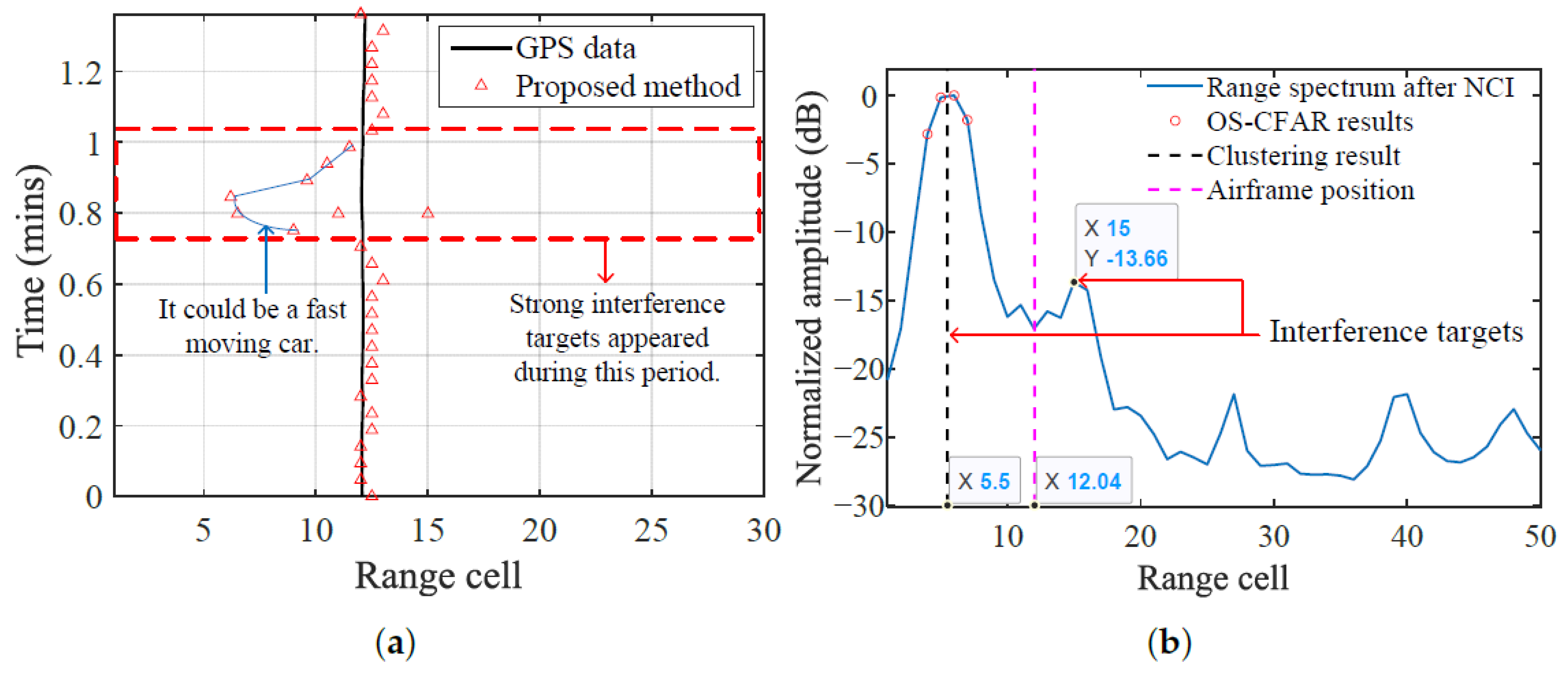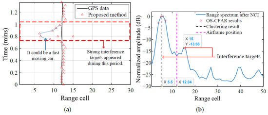In the previous subsection, the fixed strong interference can be easily eliminated because its position and intensity are stable. The target detection is more susceptible to the dynamic interference, such as moving cars since the SUR can fly at low altitude. Figure 18a shows the detection results of the proposed method and GPS data over a period of time, where the SUR is about hovering at the range cell of 12.
