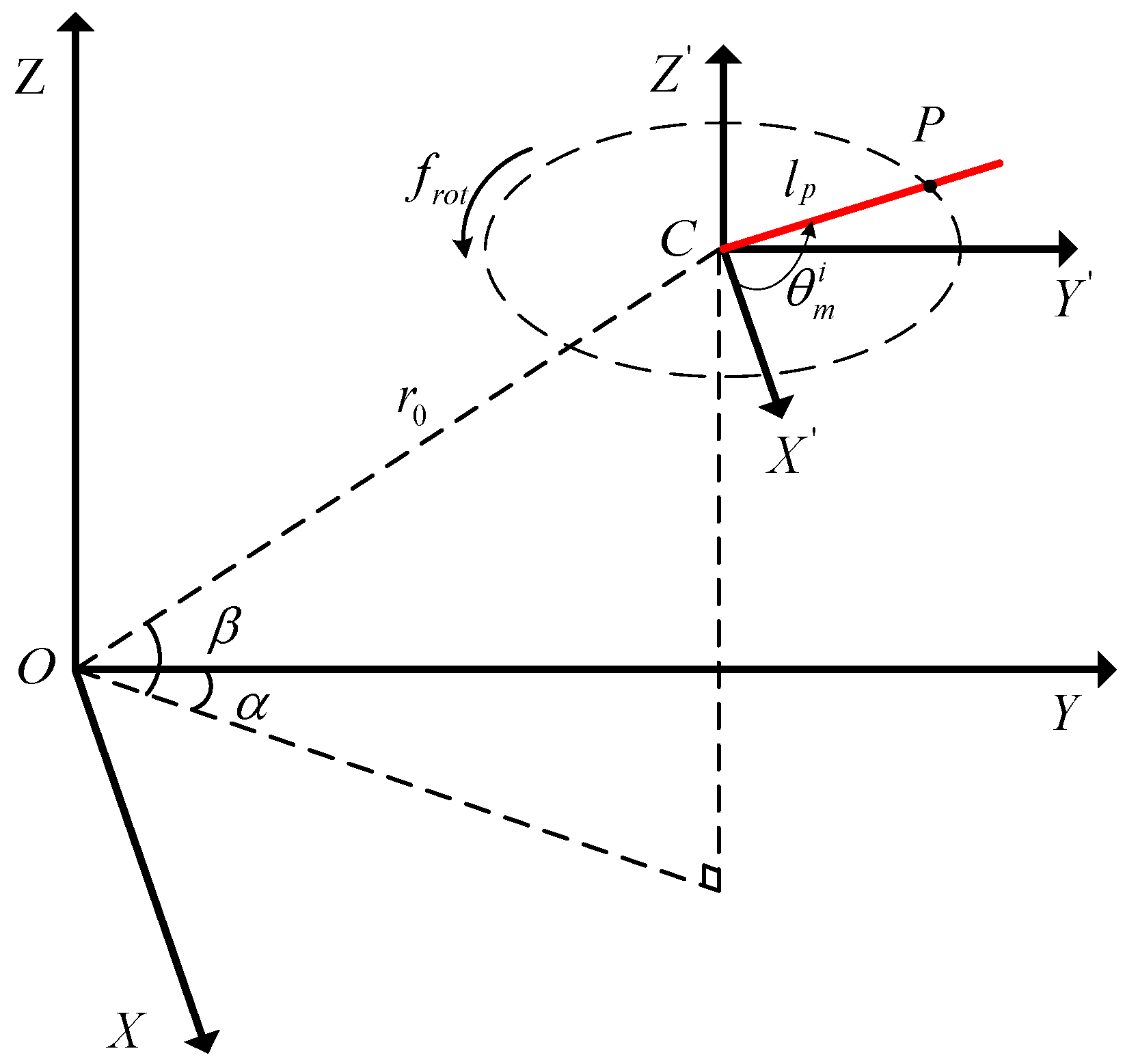 The geometry of radar (Origin O) and rotating rotor (Origin C, one blade shown for illustration as marked by red).