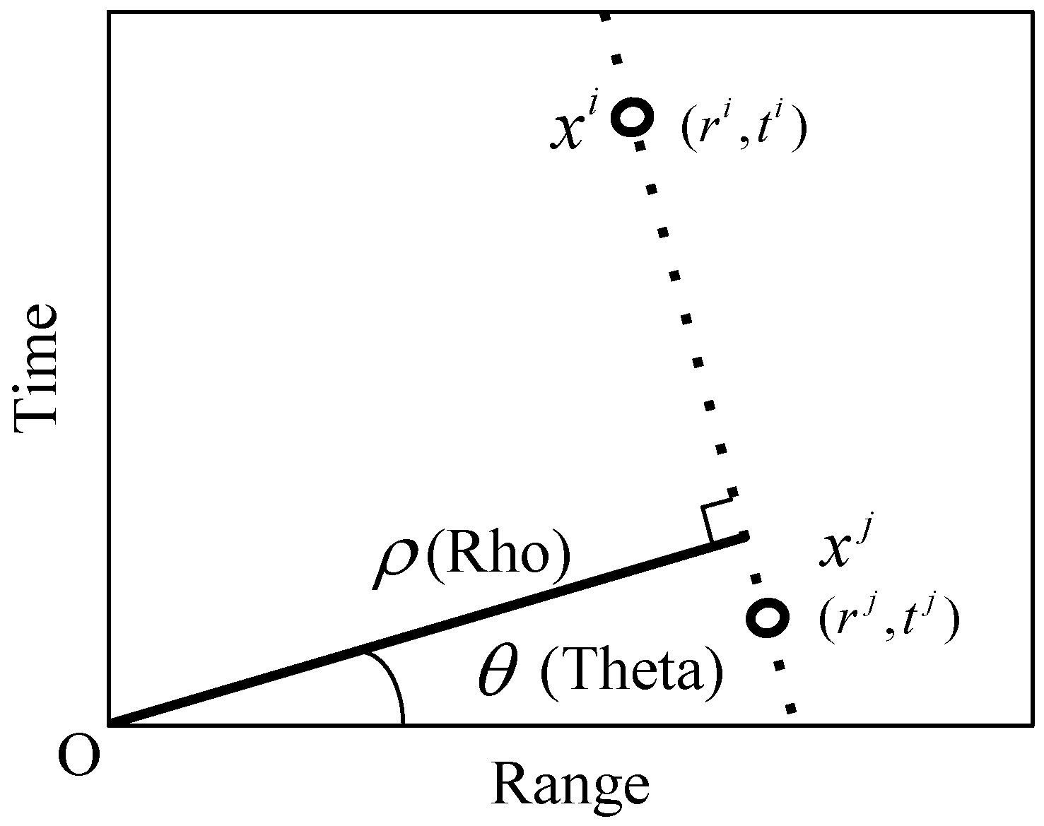 The above line can also be uniquely represented by the Hough parameters and . is defined as the perpendicular distance from Origin O to the dashed line. is the angle from the perpendicular to the range-axis and the clockwise direction is positive. Hence, the Hough parameters can be calculated by