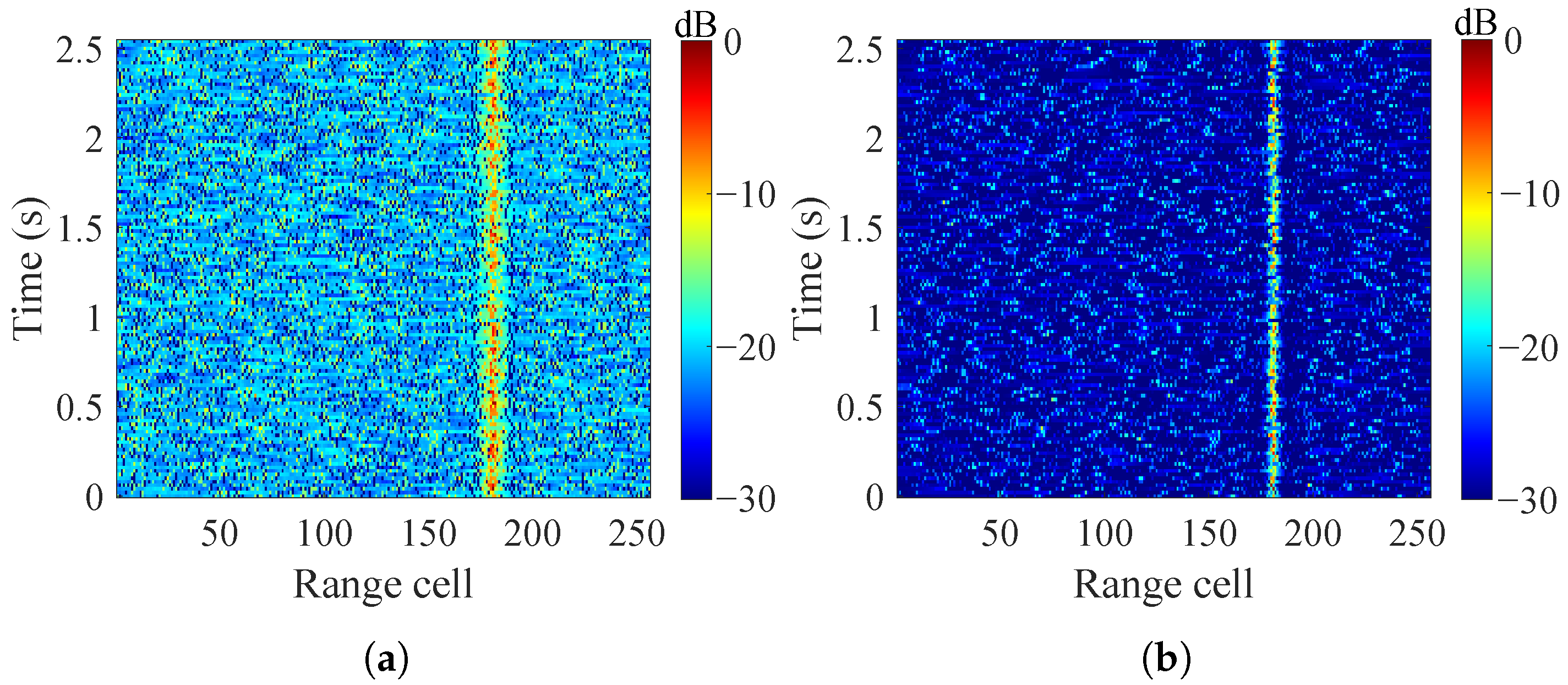 The range–time spectra via range squeezing process using (a) one and (b) four reassignment operations, respectively.