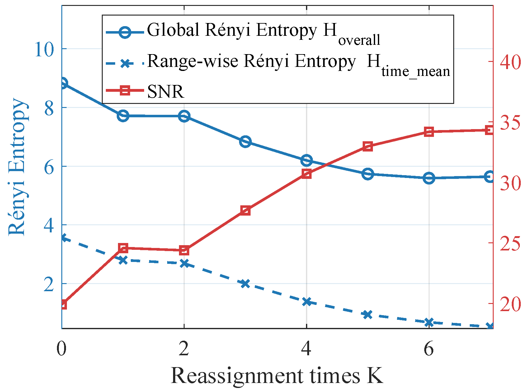 Evolution of Rényi entropy and SNR versus reassignment iterations K, illustrating joint improvement in spectral concentration and detection quality.