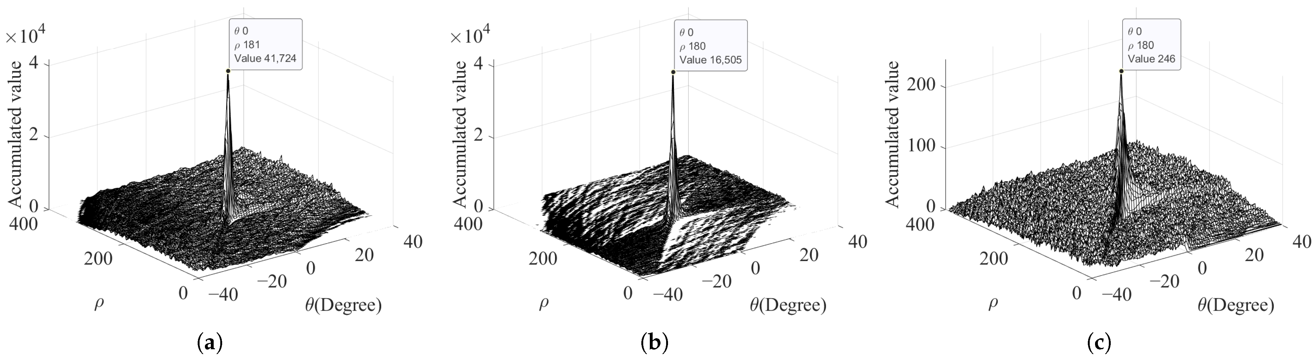 Figure 7 shows the Hough parameter accumulation results obtained by the proposed method, the previous ergodic Hough transform [47] and standard Hough transform [44], respectively.