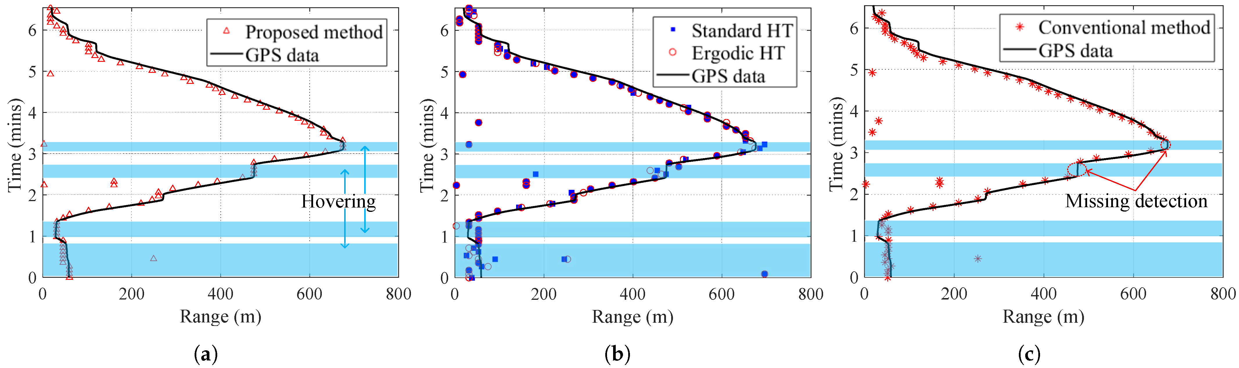 The maximum radial range of the SUR is about 675 m. The blue transparent rectangle areas indicate that the SUR is mostly hovering. The results of proposed method are marked by a red triangle, shown in Figure 16a. It is clear that the detection results using the proposed method basically coincide with the GPS data despite some range errors. The results of ergodic HT and standard HT are presented in Figure 16b. As can be seen, the consistency between the two methods and GPS data is obviously worse than that if the proposed method, especially when the SUR is hovering, which may be caused by the dispersive nature of MDS. Figure 16c gives the results of the conventional method. As illustrated, since the non-coherent integration (NCI) processing does not achieve the accumulation of MDS, the conventional method fails to detect the hovering SUR when the range is about 475 m and 675 m, respectively.