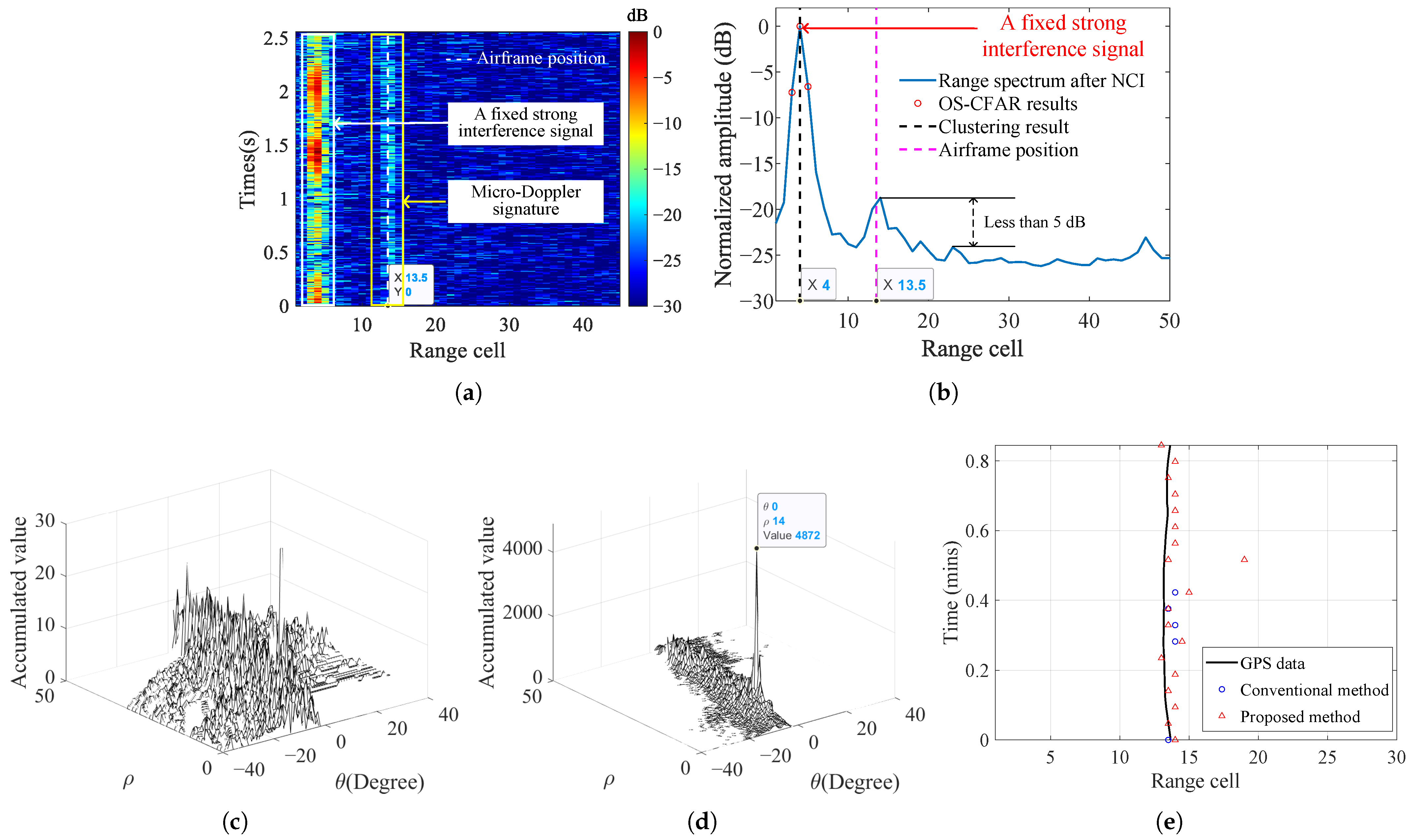 Micro-Doppler signature detection in very-low-SNR condition. (a) Range–time spectrum after clutter mitigation, (b) conventional incoherent integration and clustering result, (c) standard Hough transform result, (d) result of the proposed method, (e) detection plot comparison.