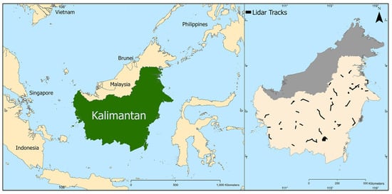 (Left) Location of Indonesian Borneo (Kalimantan) in South-East Asia. (Right) NASA CMS LiDAR flight path locations, indicating LiDAR tracks (black color) in 85 sites in Indonesia Borneo.
