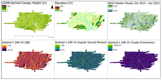 Like previous studies [12,47], we integrated several sources of common remote sensing data in our data pipeline, including Landsat-8 (8 spectral bands), Sentinel-1 (4 band Synthetic Aperture Radar), land cover fractional coverages from the Copernicus satellite mission, digital elevation model, and NASA CMS airborne LiDAR. Because of data loss due to cloud cover and other atmospheric effects, Landsat data were temporally sampled from August 2014–January 2015 (the time period of the LiDAR data plus 2 months before and after). We applied cloud masking to all Landsat imagery using the pixel QA band in Google Earth Engine, which employs the CFMask algorithm to identify clouds, cloud shadows, and other quality issues. Only pixels classified as clear in the QA band were included in our analysis. In addition to these data, we also integrated other data sources, such as indices commonly used to assess vegetation (e.g., NDVI, NDWI, NDII, EVI, for Landsat 8), Gray-Level Co-occurrence Matrix (GLCM) texture metrics [36] for all spectral data, and climatic data from WorldClim [48]. All these data sources (listed in Table 1) were compiled into a data processing pipeline which produced our dataset of 336 features for each LiDAR value (examples in Figure 2), resulting in about 2 million observations. The definition of each data feature is listed in Supplementary Material Table S1.