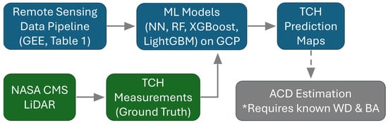 ML framework with GEE remote sensing data pipeline and GCP infrastructure with ML model development and deployment for TCH prediction and optional ACD prediction. * ACD estimation requires additional information about Wood Density (WD) and Basal Area (BA) that is not directly predicted by our model.