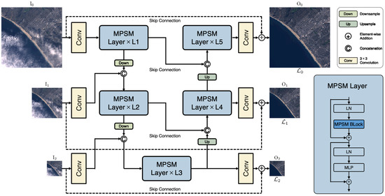 Figure 1 shows the overall architecture. Initially, the network takes , , and as inputs. is the original image, is downsampled by a factor of two, and is obtained by further downsampling . Before being fed to the encoders, , , and are processed by a 3 × 3 convolutional layer to extract shallow feature embeddings. These shallow embeddings are then fed into the MPSM Layer to capture global contextual information. Subsequently, the decoders take these global embeddings and progressively reconstruct the high-resolution representations. A 3 × 3 convolutional layer is applied at the end of the decoder level to further refine the characteristics. Each encoder–decoder level contains multiple MPSM Layers, with the layer count progressively increasing from top to bottom to preserve computational efficiency. At each level, the skip connection [50] integrates the input image with the network output through element-wise addition, yielding the final output. The detailed configurations of the proposed architecture are shown in Table 1.