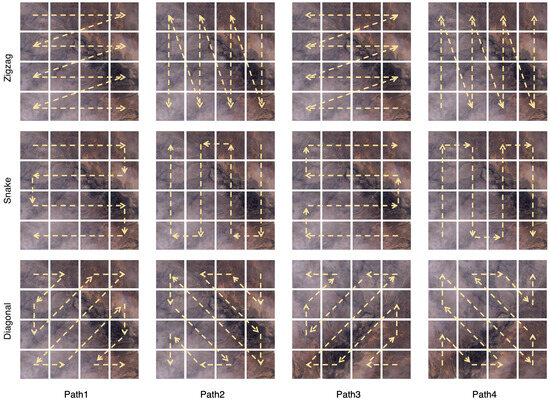 In MPS2D, all scanning patterns feature four corner-initiated traversal paths (top-left, top-right, bottom-right, bottom-left) (Figure 3). The detailed architecture of the ScanPattern module is presented in Figure 2d. Given an input , the ScanPattern module can be formally expressed in Equation (8):