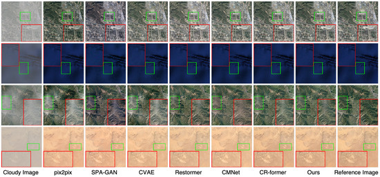The detection of changes in remote sensing depends on high-quality multi-temporal imagery to accurately capture spatial changes occurring in a region over time [1,2,3,4,5]. However, cloud cover significantly degrades image quality and can result in unreliable change detection. A report from the International Satellite Cloud Climate Program indicates that clouds cover approximately 63% of the Earth’s surface [6], which makes cloud cover a pervasive phenomenon in remote sensing imagery. The resulting interference results in the loss of critical ground data in affected images, potentially leading to inaccurate model outputs and poor decision-making. Therefore, improving the quality of cloudy images is essential for accurately analysis of the collected image data.