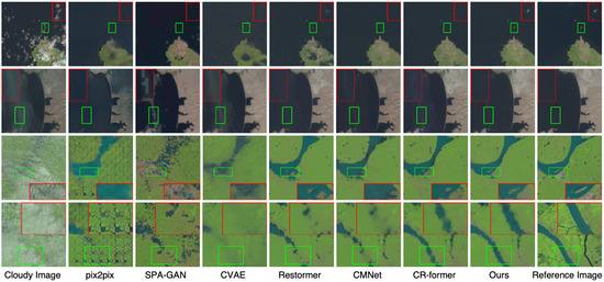 Figure 4 illustrates that our method significantly outperforms other approaches. With pix2pix [7], SPA-GAN [26], CVAE [11], and Restormer [19], residual cloud artifacts remain visible in localized areas, while with our method, large cloud-covered regions are almost completely removed. Furthermore, while CMNet [17] and CR-former [20]—two recently published approaches—exhibit strong cloud-removal capabilities in large occluded regions, as our method does, our method shows a more refined removal of residual cloud textures in small-scale regions, indicating that our multi-scale framework effectively enhances fine-detail restoration.