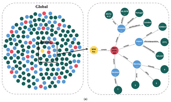 We used the Neo4j graph database to store over 4500 nodes and relationships. A portion of the nodes and relationships in the remote sensing early warning knowledge graph for fire disaster types is shown in Figure 3a. The figure displays part of the events related to wildfire disasters. The red node represents the forest fire event numbered 2017-0417-PRT, with the name provided by the EM-DAT database, and each event has a unique identifier. Connected to the “2017-0417-PRT” node are anomaly information, monitoring information, early warning information, and decision-making information (in blue). The green nodes represent specific attributes for each type of information (Figure 3b).