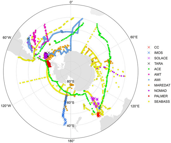 The dataset compiled by Valente et al. [33], available through the OC-CCI project v3.0 (https://doi.org/10.1594/PANGAEA.941318; accessed on 10 May 2024), includes global bio-optical in situ observations. It merged bio-optical data from 27 data sources and covered the period from 1997 to 2021. To ensure the higher quality and reliability of the measured data, only HPLC-based Chl measurements collected south of 40°S were used in this study. From the ACE, 221 surface observations were collected aboard the RV Akademik Tryoshnikov during the Austral Summer from 20 December 2016 to 19 March 2017. The SOLACE contributed 59 surface observations, collected aboard the Australia’s RV Investigator during the Austral Summer from 7 December 2020 to 31 January 2021.