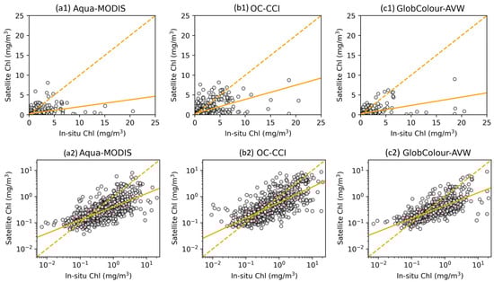 Performances of satellite-derived Chl concentrations versus in situ Chl for each product: (a1,a2) Aqua-MODIS, (b1,b2) OC-CCI, and (c1,c2) GlobColour-AVW. The linear regression trendline (solid line) is fitted to the scatter plot to depict the relationship between satellite Chl and in situ Chl. Results are presented in linear space (top row) and log space (bottom row), respectively.