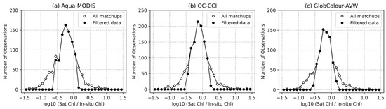Histograms of the for each product: (a) Aqua-MODIS, (b) OC-CCI, (c) GlobColour-AVW. White circles represent all match-ups, while black circles represent the filtered data within one standard deviation of the mode of for each product.