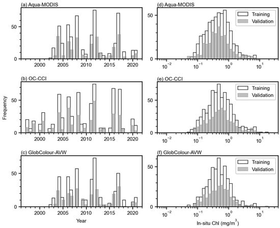 The filtered in situ Chl and Rrs match-ups (Figure 4 and Table 4) were divided into two groups: one for model training and the other for validation. To ensure the training dataset covers a wide Chl range, it includes the maximum and minimum samples from each cruise. Additionally, for each cruise, 2/3 data were randomly selected from the [minimum, median] and [median, maximum] intervals for the training data, and the remaining data were used for validation data. The numbers of training and validation samples were 535 and 275 for MODIS, 671 and 334 for OC-CCI, and 461 and 231 for GlobColour, respectively. The temporal and concentration distributions of the training (white bars) and validation (grey bars) data are shown in Figure 5.