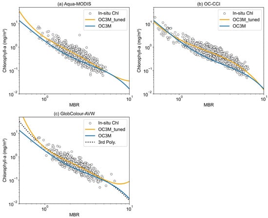 Using the training dataset and algorithm development procedure described in Section 2.4, fourth-order OCx polynomial functions were derived for Aqua-MODIS, OC-CCI and GlobColour-AVW, respectively. Figure 6 shows the polynomials relating in situ Chl to MBR, and the corresponding optimized polynomial equations are listed below. For the GlobColour-AVW dataset, the fourth-order polynomial shows an unrealistic, non-physical behaviour for MBRs larger than about 5. In this case, a more realistic model is obtained with a third-order polynomial function (see Figure 6c).