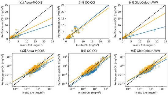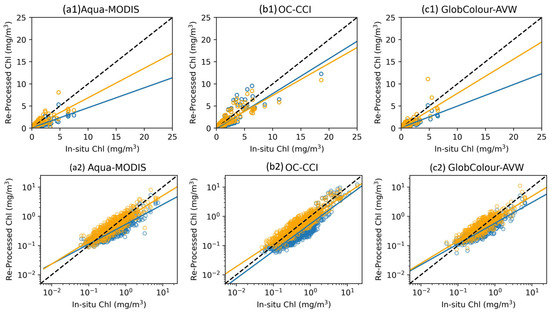 Comparison of satellite-derived Chl from the OC3M (blue) and parameter-tuned (orange) algorithm with in situ Chl from the training data. The analysis is shown for each satellite product: (a1,a2) Aqua-MODIS, (b1,b2) OC-CCI, and (c1,c2) GlobColour-AVW. The linear regression trendline (solid line) is fitted to the scatter plot to depict the relationship between satellite Chl and in situ Chl. The top row uses a linear scale, and the bottom row is a logarithmic scale.
