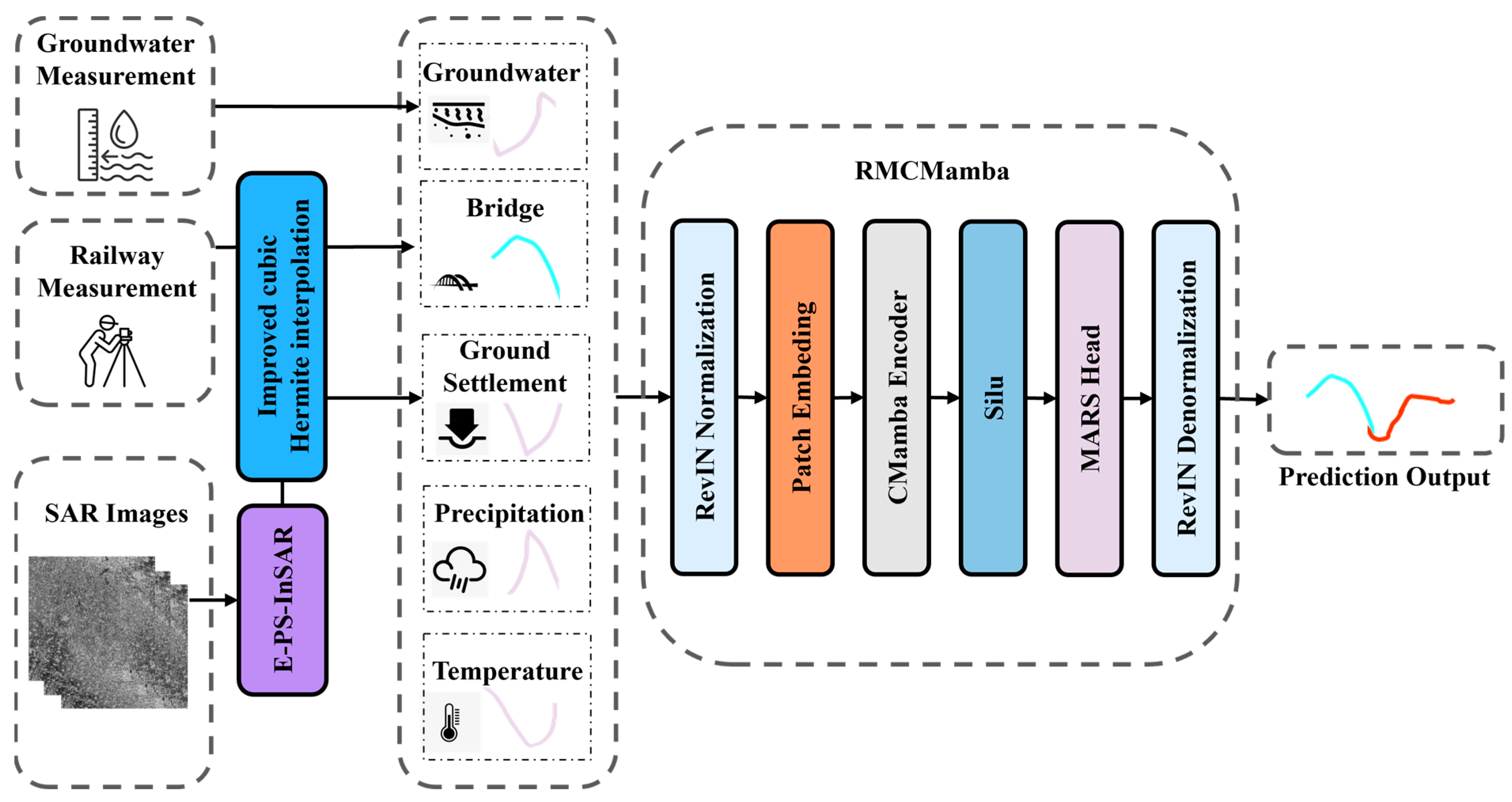 Liu J, Gong X, Liang Q, Chen Z, Lu T, Zhang R, Mao W. RMCMamba: A Multi-Factor High-Speed Railway Bridge Pier Settlement Prediction Method Based on RevIN and MARSHead. Remote Sensing. 2025; 17(21):3596. https://doi.org/10.3390/rs17213596