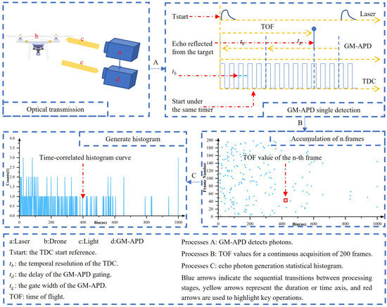As illustrated in Figure 1, GM-APD LiDAR emits laser pulses at 1064 nm, which are scattered when encountering small targets such as drones, and the GM-APD subsequently collects the scattered photons. During a single detection, the system operates in time-correlated single-photon counting (TCSPC) mode, as shown in Process A. The laser and the GM-APD are synchronized under the time-to-digital converter (TDC) clock. Simultaneously with pulse emission, the GM-APD opens its gate after a delay . Operating in synchronized mode, the detector remains active for a gating duration , while the TDC provides a temporal resolution of . The TDC records the corresponding arrival time when a return photon triggers an avalanche event. Process B records the time-of-flight (TOF) values from 200 consecutively acquired frames. The vertical axis represents the index of consecutive frames, and the horizontal axis denotes the TOF of the current frame. Process C illustrates how repeated gating accumulates the arrival times of return photons, thereby generating statistical echo signals. A histogram is constructed by collecting a fixed number of frames, where the horizontal axis represents the time bin within the gating window and the vertical axis denotes the photon counts. Processing this histogram enables the extraction of key target information, including depth and relative reflectivity. The depth is derived from the timing of photon arrivals, which reflects the distance between the detector and the target. In contrast, reflectivity is a relative measure indicating the strength of the scene’s photon reflection capability.