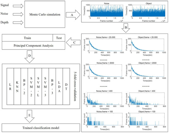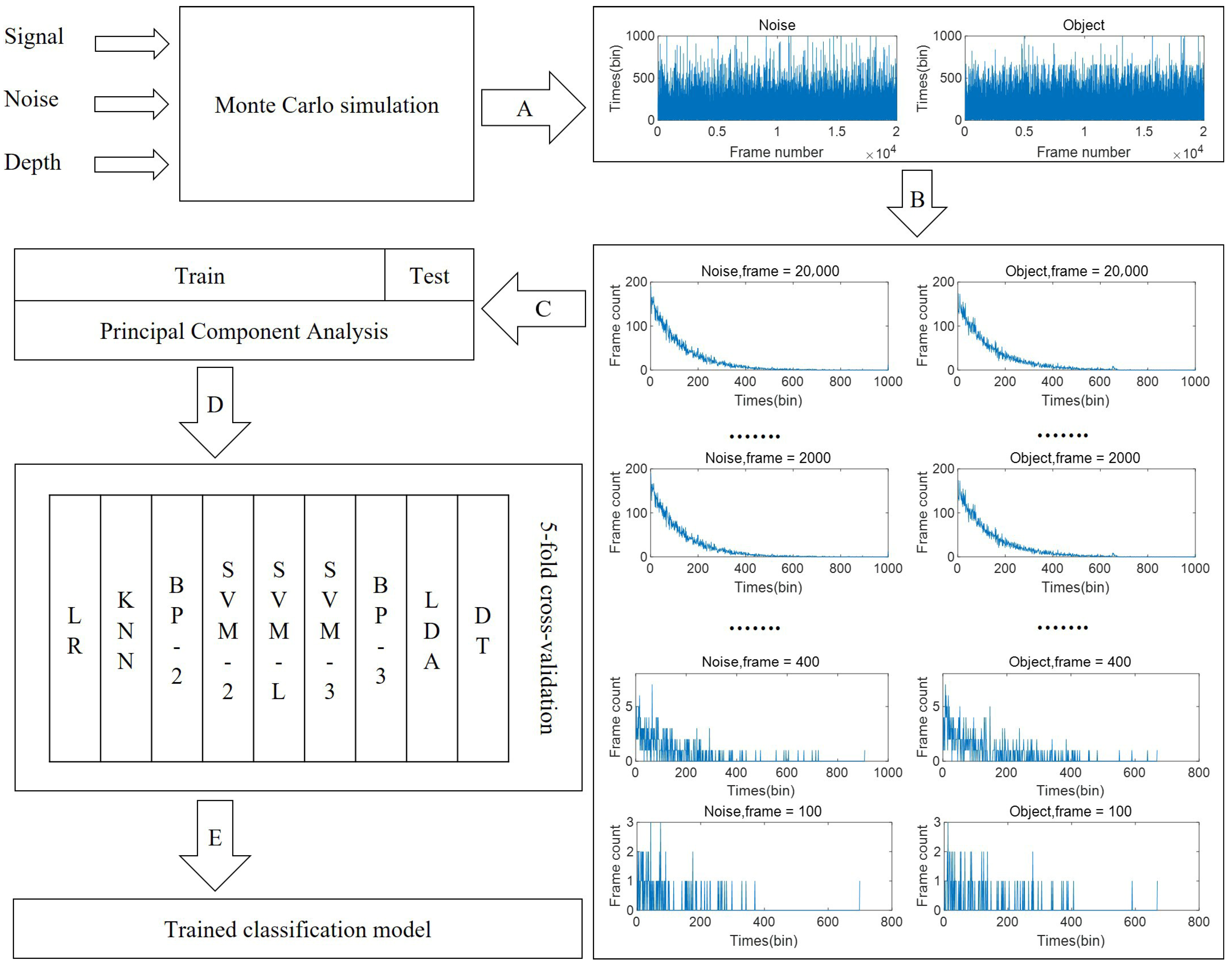 As shown in Figure 3, the simulated dataset is produced by a three-stage pipeline (processes A–C) and then used for model development (processes D–E). In process A, scene parameters and photon statistics are sampled to synthesize target and background echoes. Process B aggregates consecutively acquired frames to form per-frame histograms/features, and process C assigns labels and compiles the final training/testing sets. Before feeding data to the classifiers, we apply PCA to extract low-dimensional, decorrelated features and mitigate noise. Model training (process D) is conducted with stratified five-fold cross-validation to avoid data leakage and to obtain robust estimates. Each fold uses identical preprocessing parameters learned from the training split only, and the procedure is repeated across all folds. Process E performs final fitting on the complete training data and evaluates the selected model on the held-out test set, ensuring a fair, reproducible assessment under the same preprocessing and hyperparameter settings.