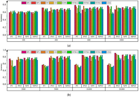 This study conducts an in-depth investigation into the impact of four feature-processing strategies, defined by whether PCA is applied (P vs. NP) and whether tail-end features are retained (T vs. NT). Accordingly, four data-preprocessing schemes are formed: PT, NPT, PNT, and NPNT. Figure 4 provides a detailed representation of the ML models’ performance under different feature processing strategies and SFNs. First, from an accuracy perspective, as the SFN exceeds 2000 frames, the accuracy of models processed with the PNT gradually surpasses that of others. Second, regarding training time, appropriate strategies like PNT can effectively reduce the duration, as depicted in Figure 5, where models based on the PNT feature processing method tend to have shorter training times across different SFNs.
