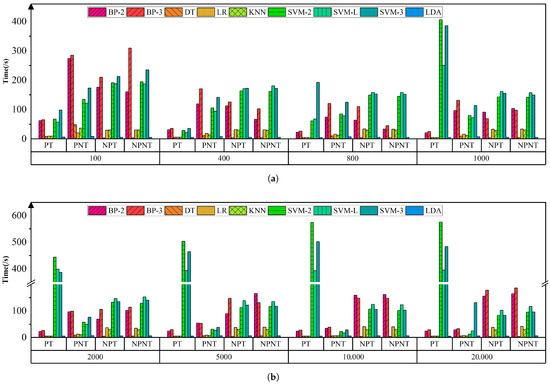 Training time for ML models with different feature processing methods at different SFNs. (a) SFN is 100, 400, 800, 1000. (b) SFN is 2000, 5000, 10,000, 20,000.