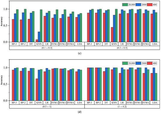 Accuracy for different models at different ESNRs. (a) ESNR distribution in noise, (0.00–0.01]. (b) ESNR distribution in (0.01–0.05], (0.05–0.10]. (c) ESNR distribution in (0.10–0.30], (0.30–0.50]. (d) ESNR distribution in (0.50–1.00], (1.00–4.20].
