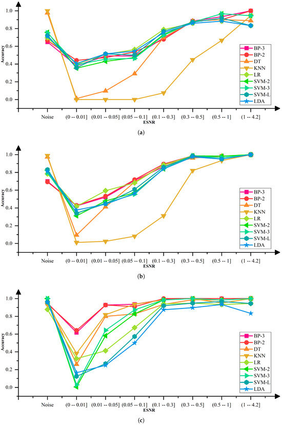 Combining the data analysis of Table 11 and Figure 6, we observe that under low ESNR (0–0.1) conditions, the performance of most algorithms declines. However, NN-BP-based algorithms exhibit exceptional performance within the ESNR range of 0–0.05. Under medium ESNR (0.1–0.5) conditions, the performance of algorithms generally improves, with LR and SVM particularly standing out in the ESNR interval of 0.3–0.5, achieving a value close to 1. In high ESNR (above 0.5) environments, the accuracy of all algorithms approaches or reaches 1, indicating that they can effectively handle high SNR data. However, consistent with the conclusion in Section 3.2, when the SFN is relatively low, the ESNR will decrease further, leading to a decline in the classification accuracy of each model. Overall, the NN-BP-based algorithm demonstrates robust performance under various ESNR conditions.