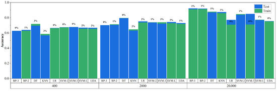 Figure 8 illustrates the analysis of training accuracy, testing accuracy, and their relative stability for ML models under three different SFNs (400, 2000, 20,000). The smaller the RCP value, the stronger the model’s stability. The results indicate that the NN-BP-3 model exhibits smaller RCP values across all frame counts, especially when SFN is 20,000, where its RCP value is only 0.0111. Conversely, the SVM-3 model has the most significant RCP value of 0.1937 among all models when SFN is 20,000, suggesting lower stability under this condition.