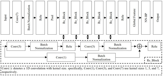 The NN-BP-enhanced ResNet is illustrated in Figure 9. To accommodate the long 1D sequences within the GM-APD gating window, the network first applies Conv(7) + Batch Normalization (BN) + Rectified Linear Unit (ReLU) to capture long-range temporal dependencies, followed by a pooling layer for local noise suppression and mild down-sampling. The backbone then stacks five residual blocks (Rs_Block). In each block, the main branch adopts Conv(3)–BN–ReLU–Conv(3)–BN, while the shortcut branch uses Conv(1)–BN for channel/length alignment; the two branches are summed element-wise and passed through ReLU. This design deepens the network, enlarges the receptive field, and mitigates gradient vanishing without incurring excessive optimization burden. After the backbone, a ReLU and global feature aggregation produce a compact representation, which is finally fed to the NN-BP head for classification output.