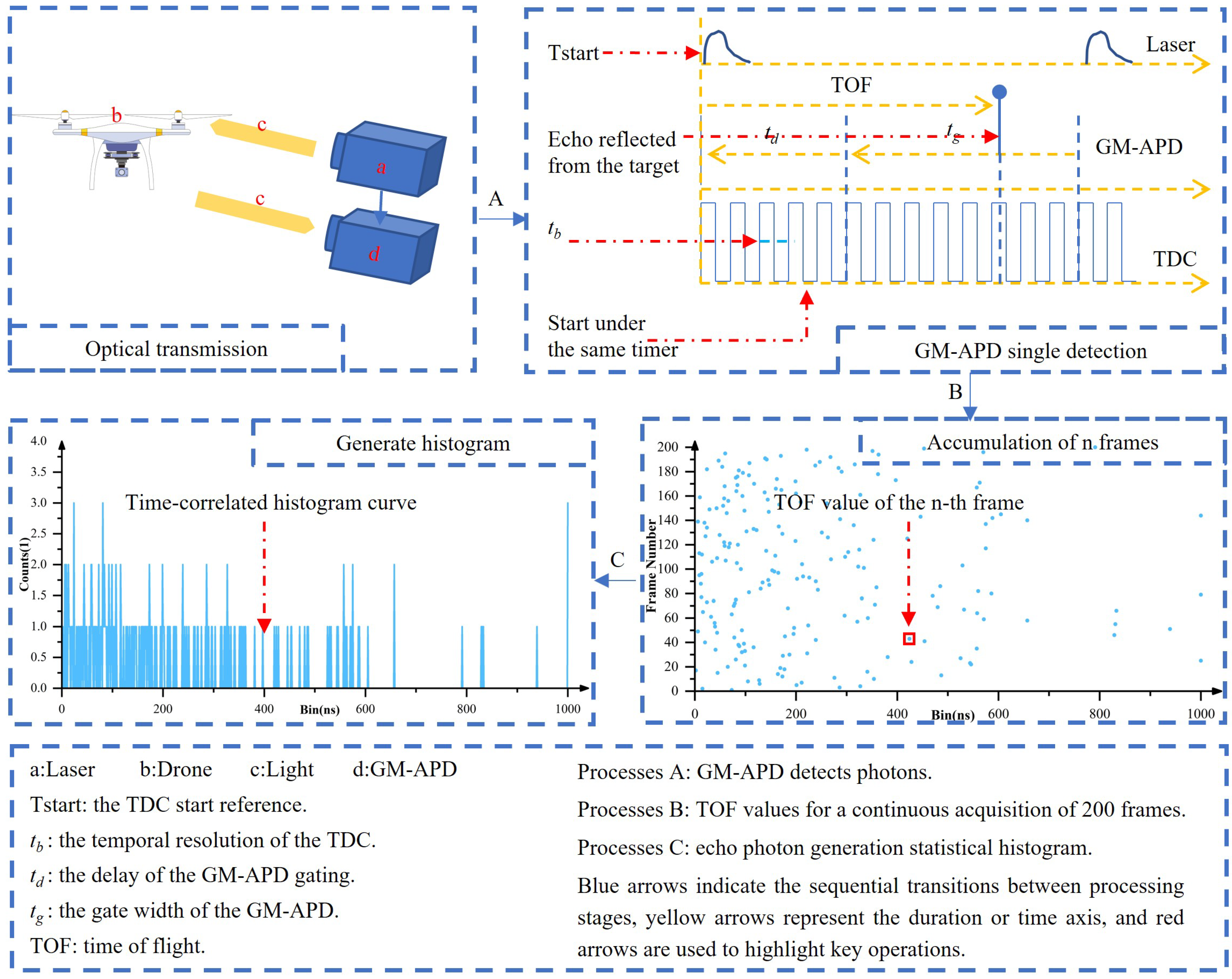 As illustrated in Figure 1, GM-APD LiDAR emits laser pulses at 1064 nm, which are scattered when encountering small targets such as drones, and the GM-APD subsequently collects the scattered photons. During a single detection, the system operates in time-correlated single-photon counting (TCSPC) mode, as shown in Process A. The laser and the GM-APD are synchronized under the time-to-digital converter (TDC) clock. Simultaneously with pulse emission, the GM-APD opens its gate after a delay t d . Operating in synchronized mode, the detector remains active for a gating duration t g , while the TDC provides a temporal resolution of t b . The TDC records the corresponding arrival time when a return photon triggers an avalanche event. Process B records the time-of-flight (TOF) values from 200 consecutively acquired frames. The vertical axis represents the index of consecutive frames, and the horizontal axis denotes the TOF of the current frame. Process C illustrates how repeated gating accumulates the arrival times of return photons, thereby generating statistical echo signals. A histogram is constructed by collecting a fixed number of frames, where the horizontal axis represents the time bin within the gating window and the vertical axis denotes the photon counts. Processing this histogram enables the extraction of key target information, including depth and relative reflectivity. The depth is derived from the timing of photon arrivals, which reflects the distance between the detector and the target. In contrast, reflectivity is a relative measure indicating the strength of the scene’s photon reflection capability.