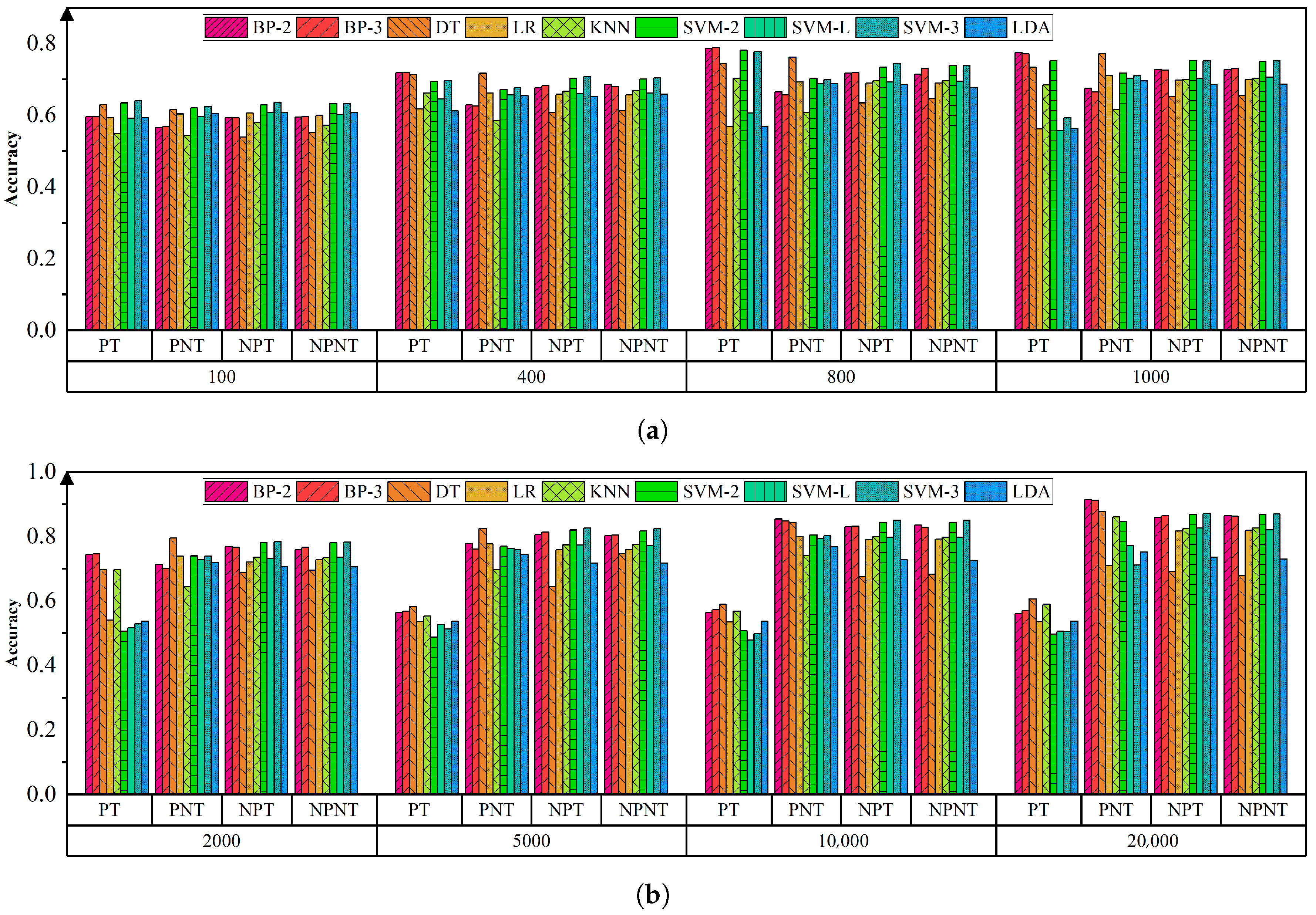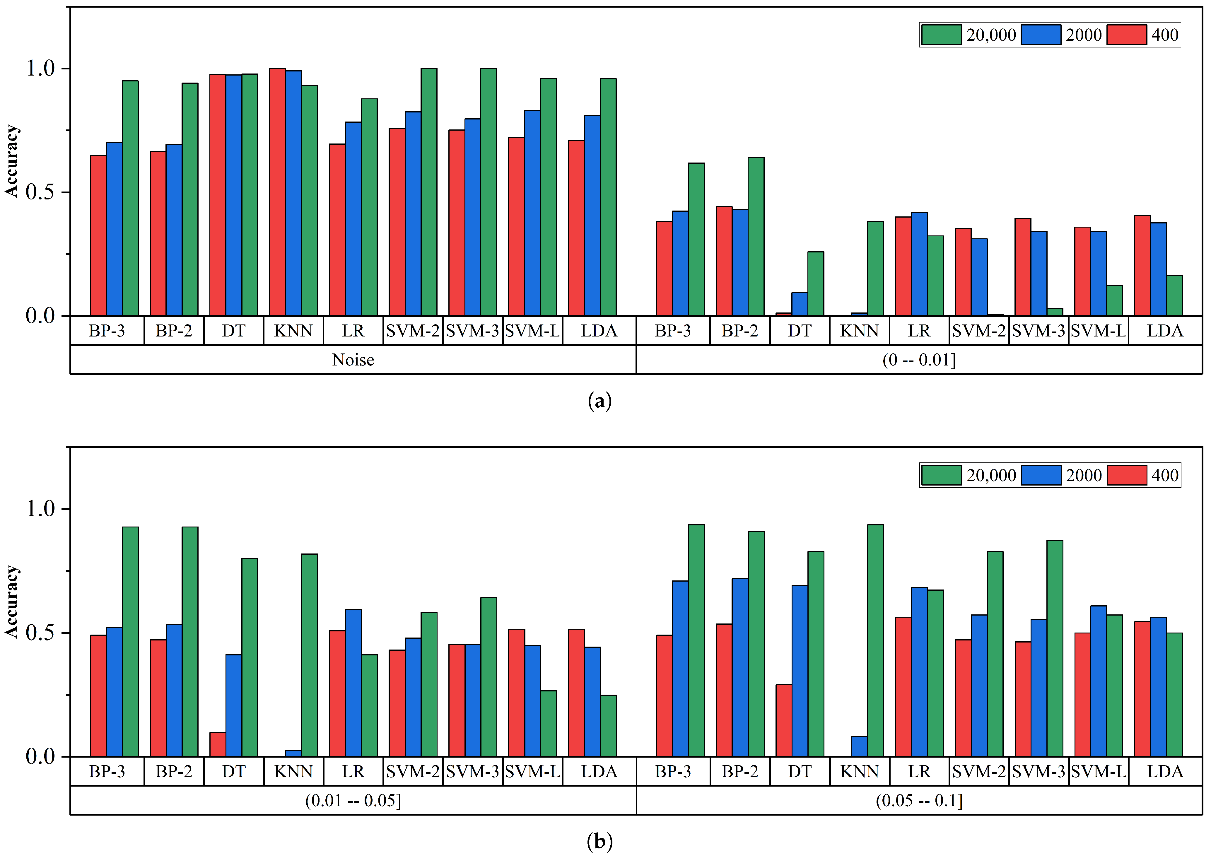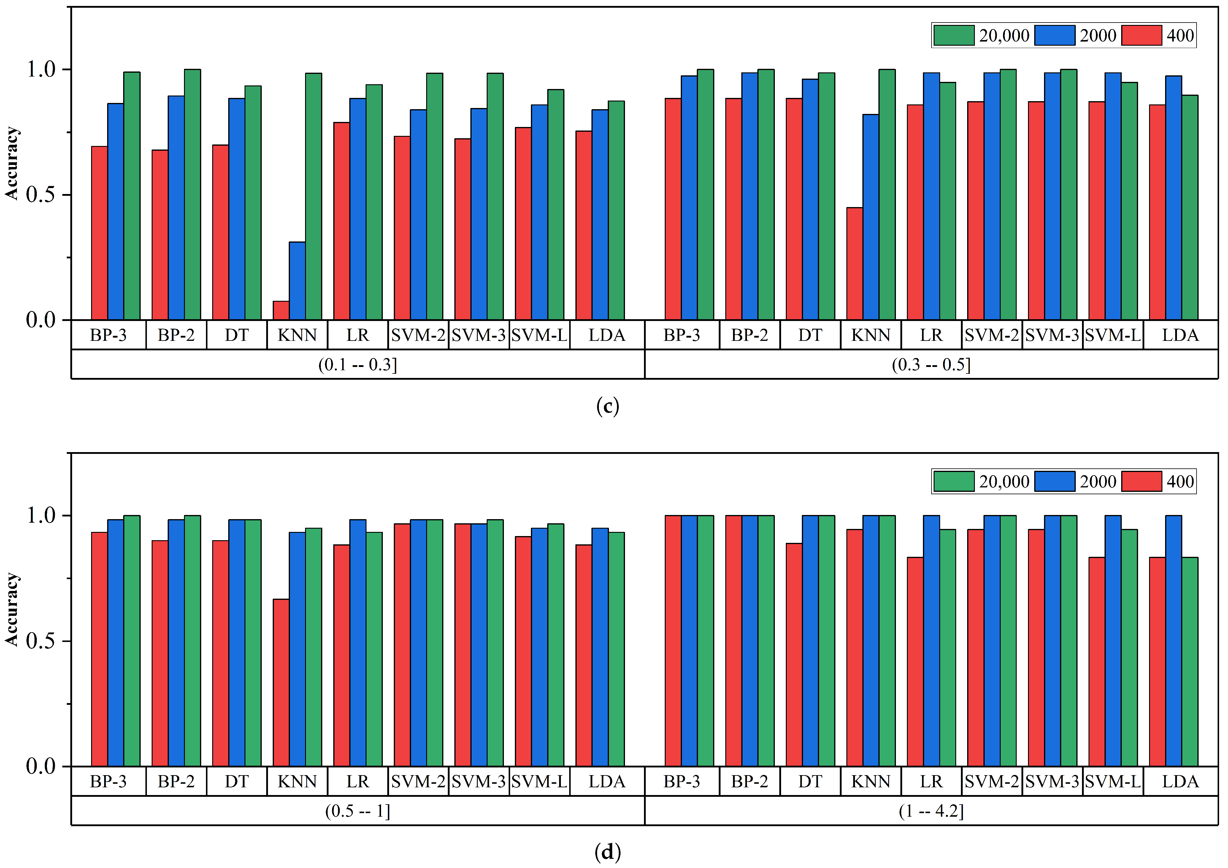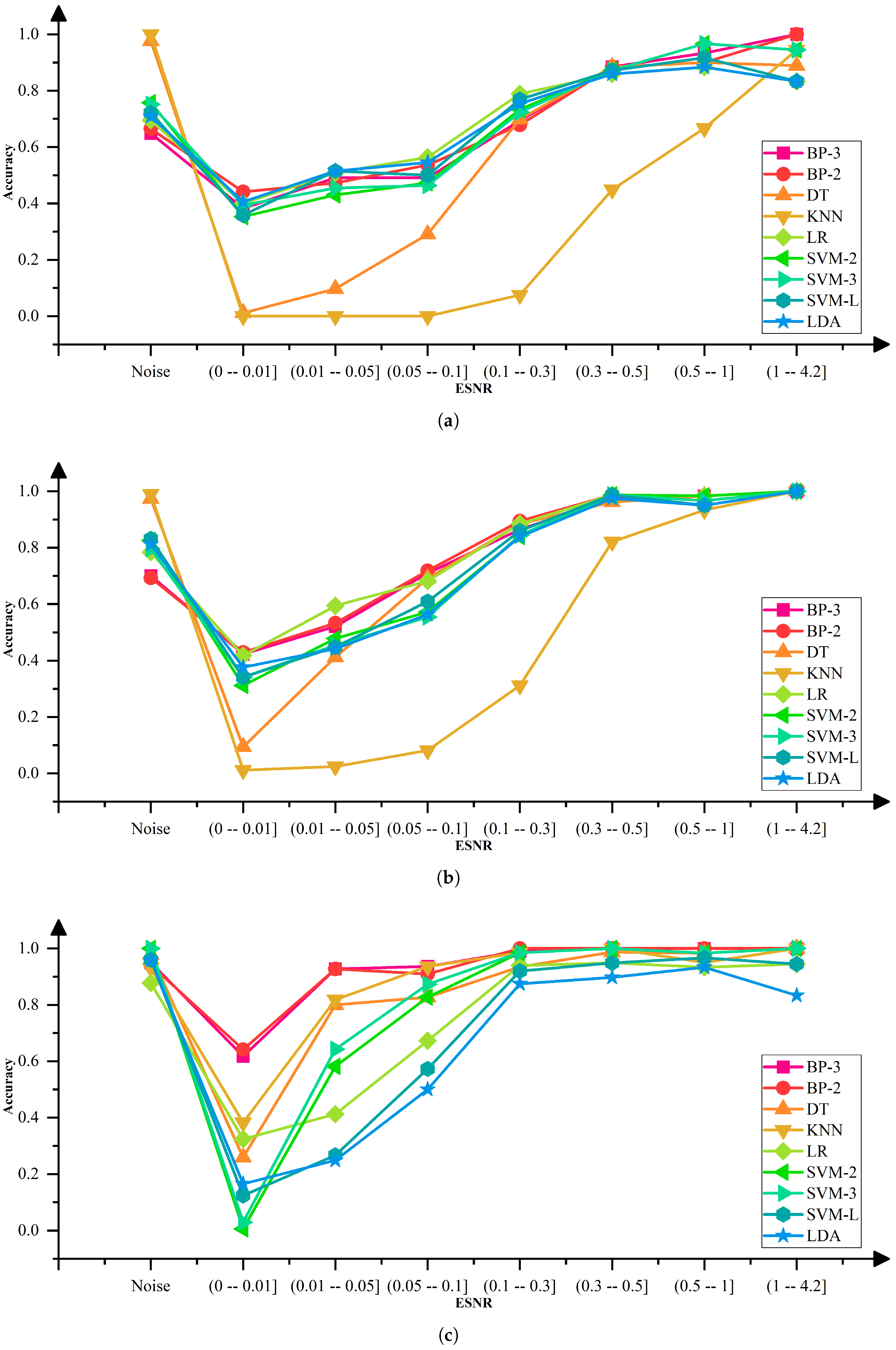 • Performance insights across models: By evaluating nine model variants derived from six baseline algorithms under varying SFNs and SNRs, we reveal distinctive performance characteristics of each model. NN-BP-3 achieves the highest test accuracy (0.9213) and the lowest RCP (0.0111) at SFN = 20,000, LDA records the shortest training time (0.38 s), and DT maintains robust accuracy (0.7171–0.8247) across SFNs, providing practical guidance for selecting optimal models in different operational conditions.