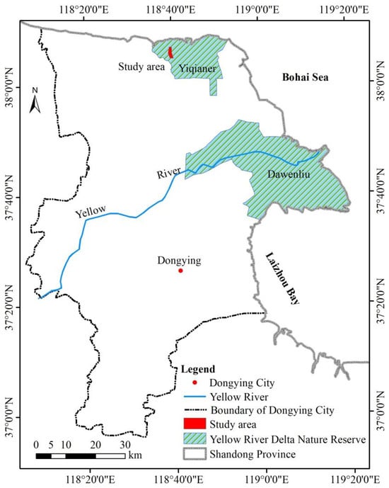 Location of the study area within the Yiqianer Management Station in Dongying City, Shandong Province, China.