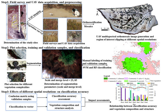 Figure 2 shows the schematic process of the workflow of this study, and illustrates the entire research process divided into three steps, with each step showing the progression from left to right. The object-oriented example-based feature extraction with support vector machine (OEFESVM) approach and random forest (RF) classifier have been successfully used to identify vegetation patches using satellite images with 1 m to 5 m spatial resolution, and map tidal marsh vegetation communities using 10 cm spatial resolution UAV imagery [14,32,33]. In order to classify vegetation communities, the OEFESVM and RF method were utilized to generate vegetation community maps for seven plots with different vegetation complexities.